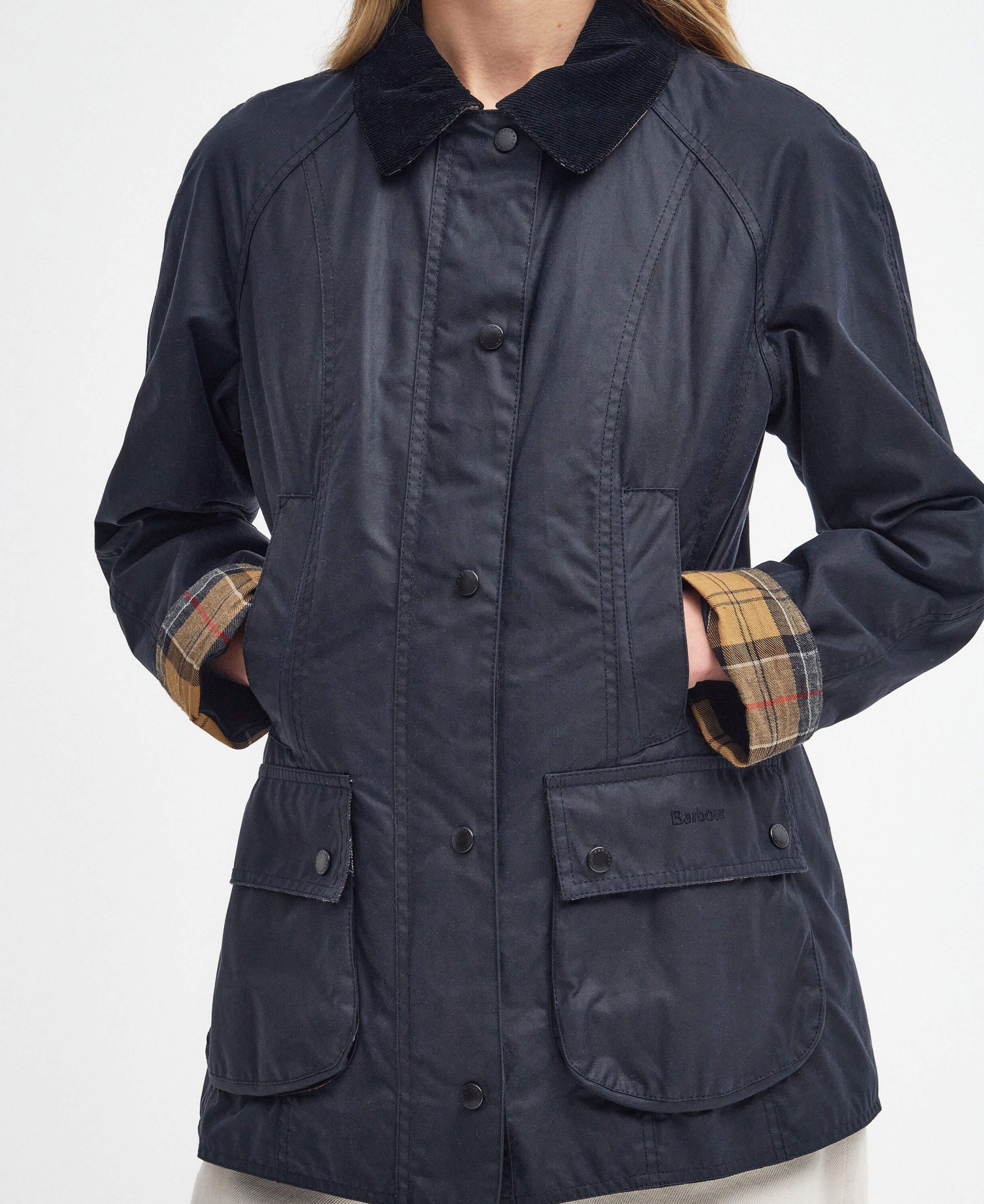 L’emblème du paysage britannique revisité pour un look féminin, la Beadnell Wax s’inspire du légendaire Bedale et se distingue par une coupe moderne et des coutures affûtées qui soulignent une silhouette élancée tout en conservant l’authenticité Barbour. Le corps en coton ciré Sylkoil 6 oz, résistant aux intempéries, est doublé d’un coton intérieur imprimé du tartan signature, offrant une protection toute l’année, en superposition ou portée seule. Le col en velours côtelé, la patte de col « storm fly » ainsi que la fermeture éclair robuste, renforcées d’un rabat à pression, assurent une barrière contre le froid. Les poches avant sont doublées de moleskin pour réchauffer les mains, tandis que les poches basses arrondies, ornées de broderie Barbour sur le rabat gauche, ajoutent une touche de prestige. Longueur dos : 74 cm.